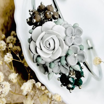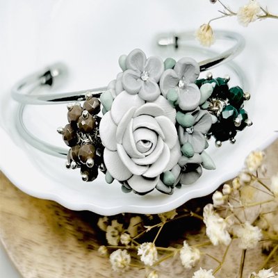 Be the first to review “Grey and olive green floral silver cuff bracelet”